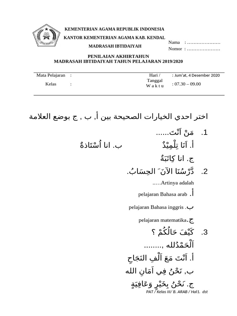 Bahasa Arab merupakan salah satu mata pelajaran penting di Madrasah Ibtidaiyah (MI). Salah satu Kompetensi Dasar (KD) yang harus dikuasai oleh siswa kelas 3 MI adalah KD 3.3, yang berfokus pada pemahaman dan penggunaan fi’il madhi (فعل الماضي), atau kata kerja lampau. Penguasaan fi’il madhi sangat penting karena menjadi dasar untuk memahami struktur kalimat dan menceritakan peristiwa yang telah terjadi. Artikel ini akan menyajikan contoh soal KD 3.3 Bahasa Arab kelas 3 MI yang dirancang untuk menguji pemahaman siswa tentang konsep fi’il madhi, perubahan bentuknya sesuai dhamir (kata ganti), dan penggunaannya dalam kalimat sederhana.