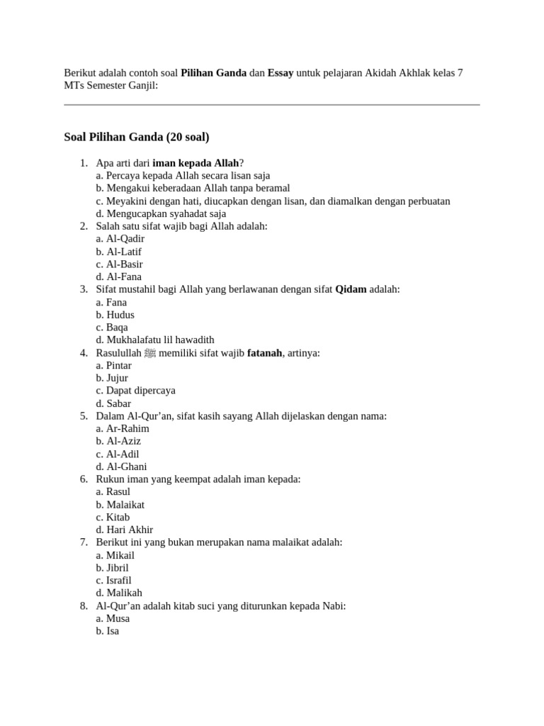 Mempelajari Akidah Akhlak di tingkat Sekolah Menengah Pertama (SMP) merupakan fondasi penting bagi pembentukan karakter religius dan moral siswa. Khususnya bagi siswa kelas 7 semester 1, materi Akidah Akhlak yang diajarkan bertujuan untuk memperkenalkan konsep-konsep dasar keimanan, adab, dan perilaku terpuji. Untuk memastikan pemahaman yang optimal dan kesiapan dalam menghadapi evaluasi, menguasai contoh soal adalah salah satu strategi belajar yang efektif. Artikel ini akan memandu Anda secara lengkap tentang cara mengunduh contoh soal Akidah Akhlak kelas 7 semester 1, serta memberikan tips dan wawasan mendalam agar proses belajar menjadi lebih bermakna.